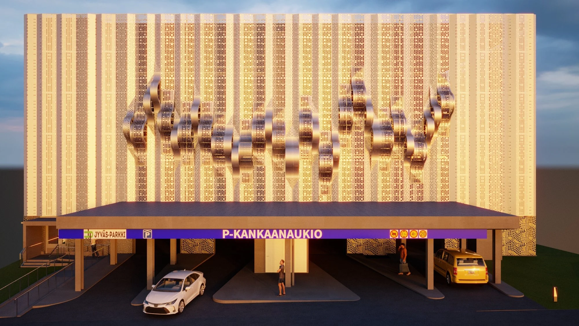NEON were commissioned to design an integrated sculpture for the facade of a car park for the new Kangas (fabric in Finnish) residential area in Jyväskylä, Finland.